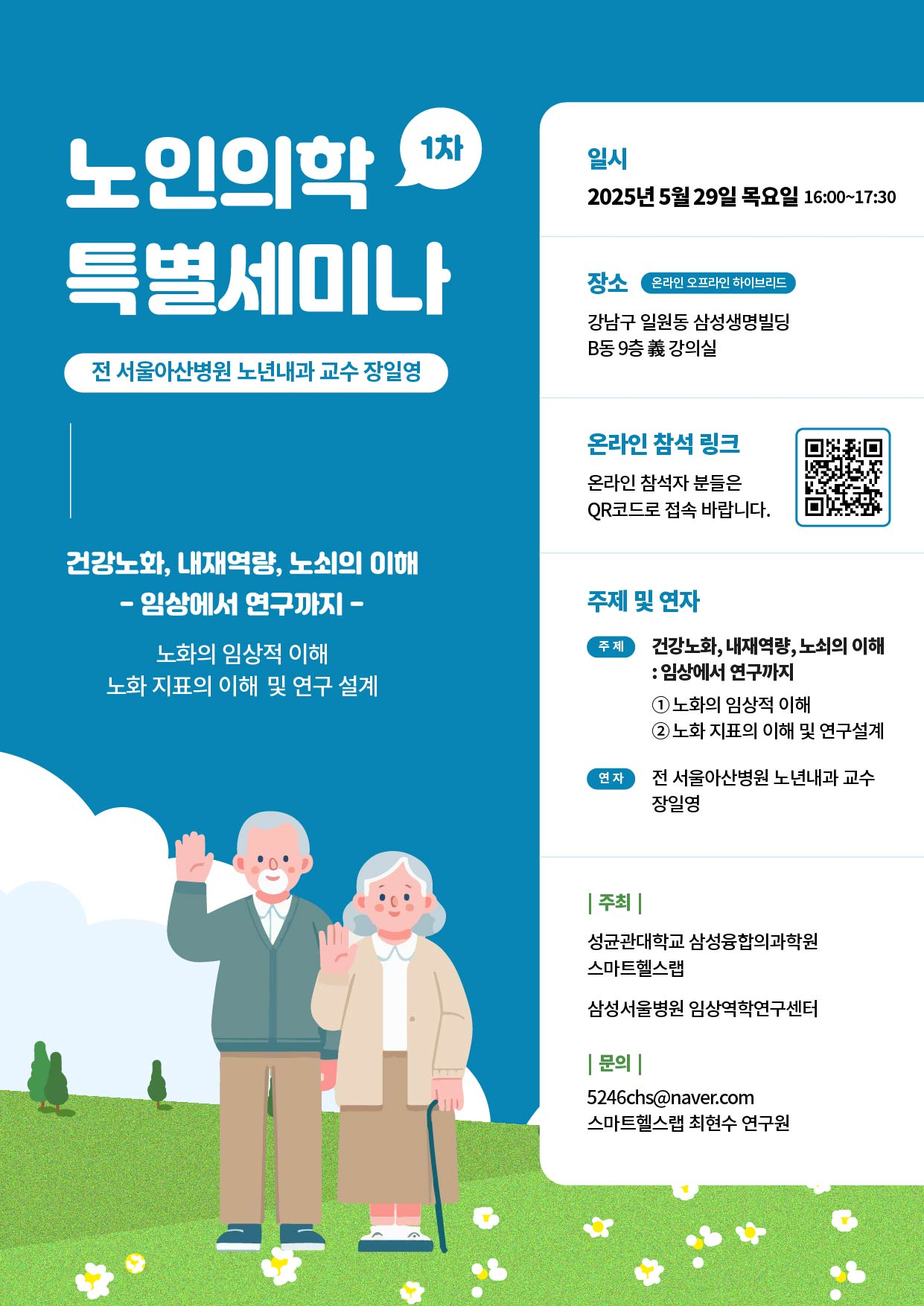 삼성융합의과학원 스마트헬스랩, 삼성서울병원 임상역학연구센터가 주최한 제 1회 노인의학 특별세미나는 전 서울아산병원 노년내과 장일영 교수님께서 '건강노화, 내재역량, 노쇠의 이해 : 임상에서 연구까지'를 주제로 강연해 주실 예정입니다.